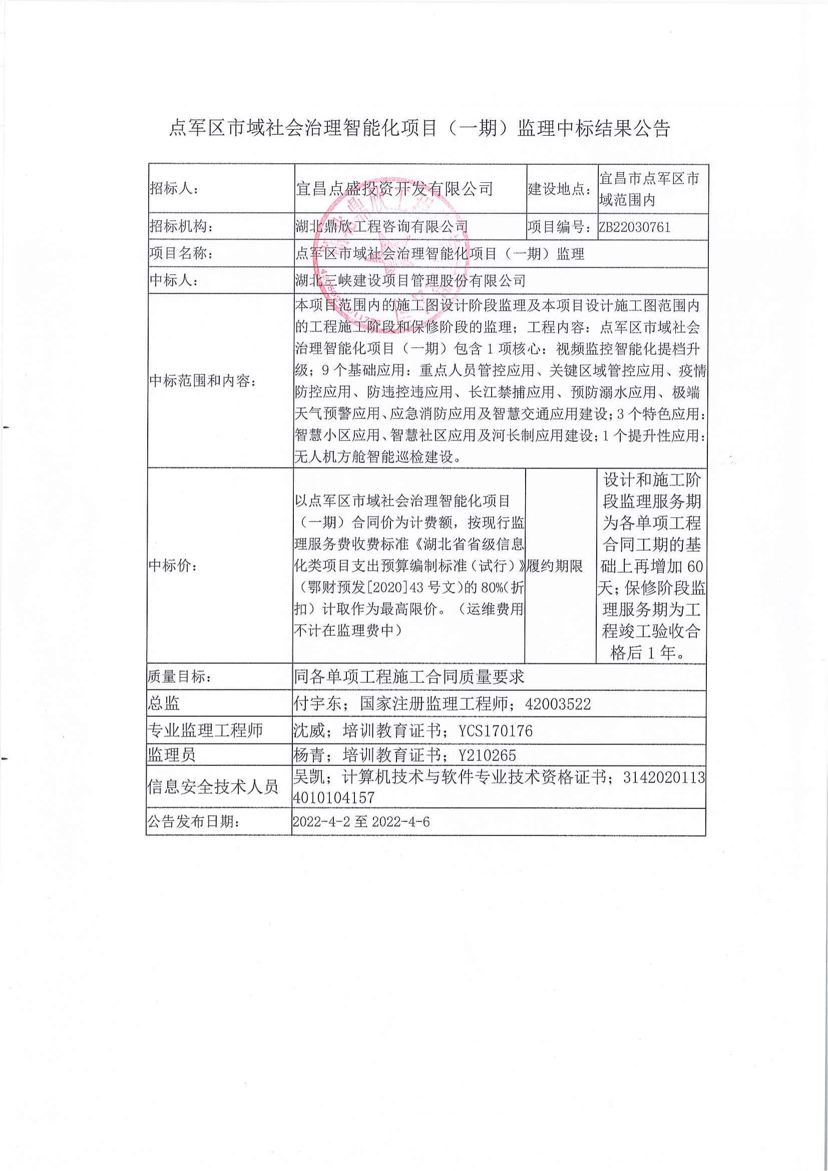 點軍區(qū)市域社會治理智能化項目(一期)?監(jiān)理中標結果公告