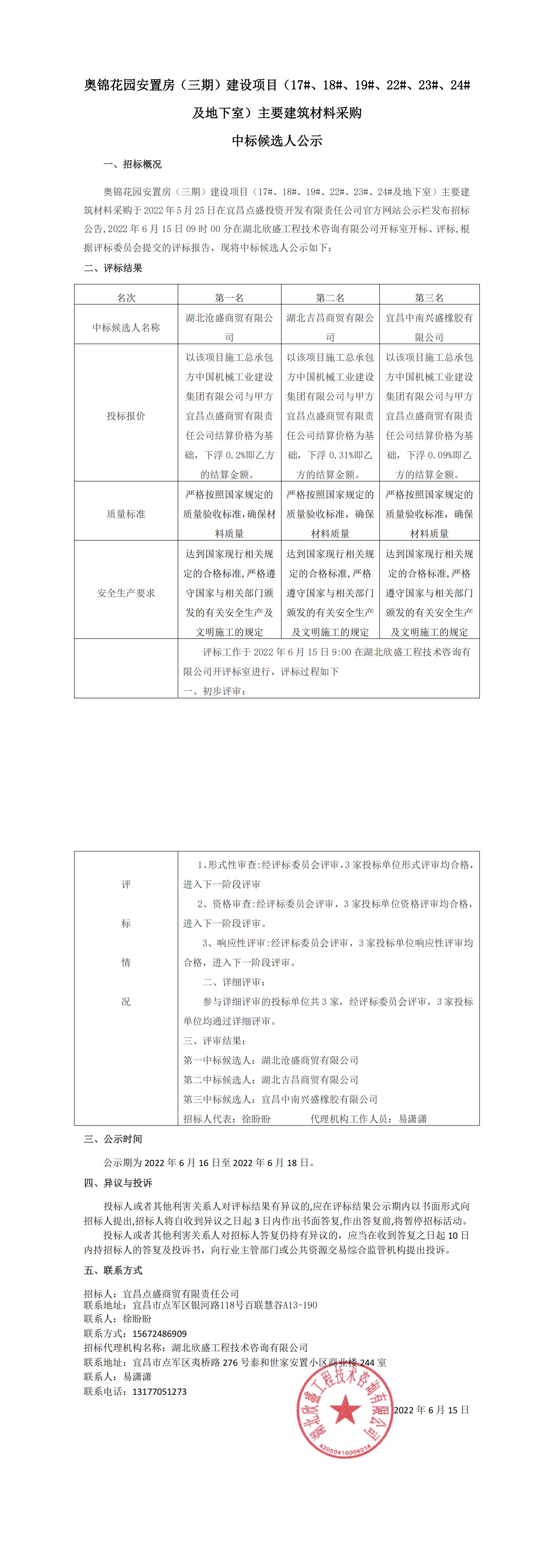 奧錦花園安置房(三期)建設(shè)項(xiàng)目(17#、18#、19#、22#、23#、24#及地下室)主要建筑材料采購中標(biāo)候選人公示