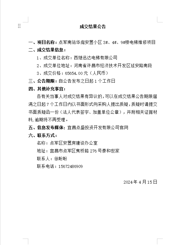 點(diǎn)軍南站華庭安置小區(qū)3#、4#、9#樓電梯維修項(xiàng)目成交公告
