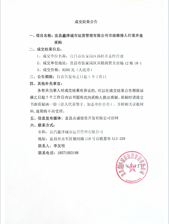 宜昌鑫澤城市運(yùn)營(yíng)管理有限公司市政維修人行道井蓋采購項(xiàng)目成交公告