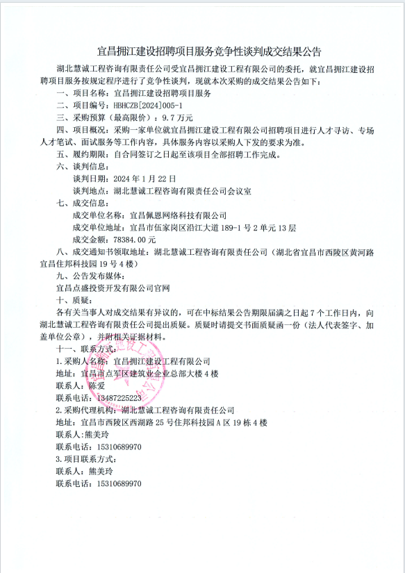 宜昌擁江建設(shè)招聘項目服務競爭性談判成交結(jié)果公告