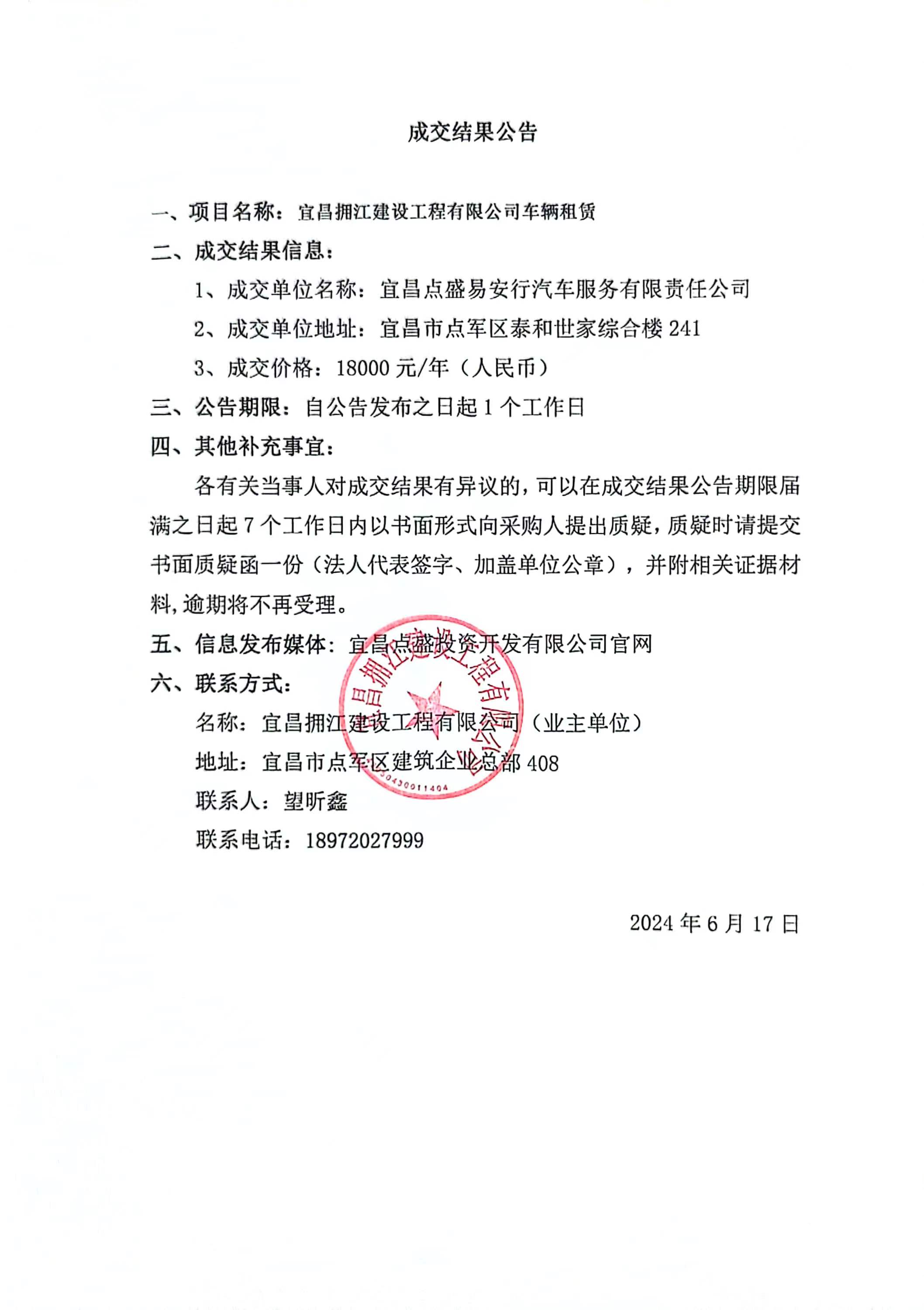宜昌擁江建設(shè)工程有限公司車輛租賃項目成交公告
