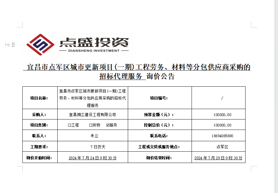 宜昌市點軍區(qū)城市更新項目(一期)工程勞務(wù)、材料等分包供應(yīng)商采購的招標(biāo)代理服務(wù)詢價公告