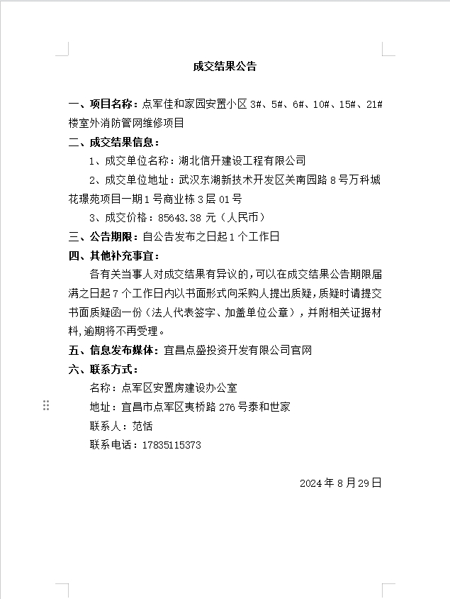 點(diǎn)軍佳和家園安置小區(qū)3#、5#、6#、10#、15#、21#樓室外消防管網(wǎng)維修項(xiàng)目成交公告