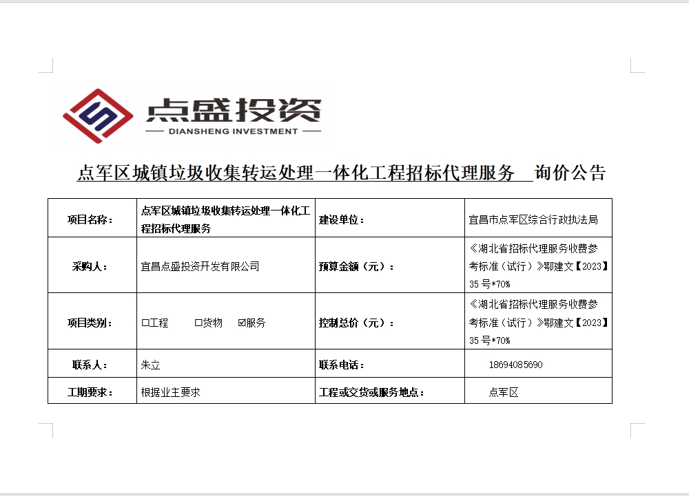 點軍區(qū)城鎮(zhèn)垃圾收集轉(zhuǎn)運處理一體化工程招標代理服務詢價公告