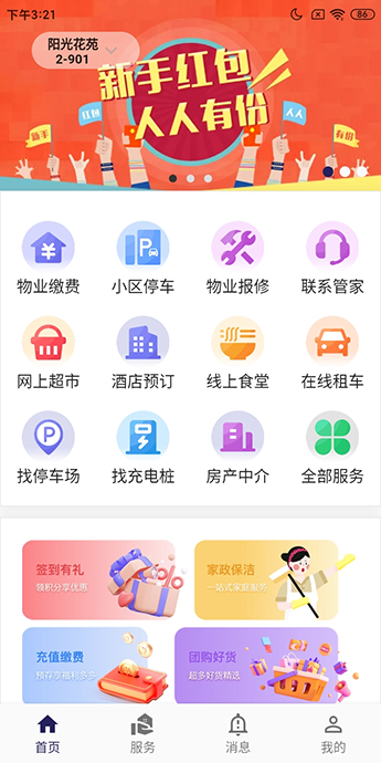 包括物業(yè)繳費(fèi)、小區(qū)停車、物業(yè)報(bào)修、意見反饋、樓棟管家、賬單查詢、訪客邀請(qǐng)、家政清潔、養(yǎng)老護(hù)理、寵物代養(yǎng)等功能。
